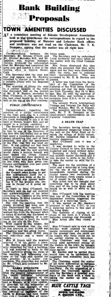 It’s a topic that hasn’t been out of the headlines in recent times: public toilets. But looking back at the newspapers from November 1965, it seems that not much progress has been made on the subject in 60 years. Raised at a meeting of the Kinsale Development Association (KDA)—a body formed to promote the town—there was an expectation that the best place to situate the public facility would be at the top of Pier Road. The location was certainly not ideal for some, but the £2,000 price tag raised an eyebrow or two.